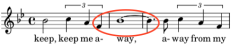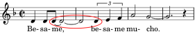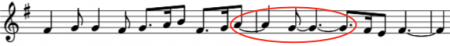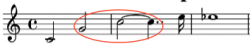 This duration ratio was first used by Henry Purcell in a ground he wrote in 1680. Shown at the left, this particular variation on the ground (the sixth in the piece) achieves a 0.917 duration ratio with a dotted half note followed by a half note tied to a dotted eighth note. The interval is a major second going downward in pitch (-2 MIDI). Calculation: (8 + 3) / 12 or 0.917.