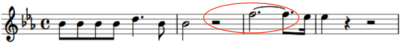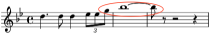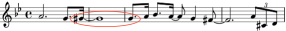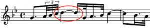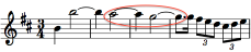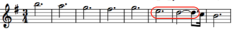 While the 0.094 duration ratio was used as early as the 1600s incorporating rests, it was not until Handel’s Messiah in 1741 that it was used in note patterns. Shown at the left is the first example found, that in “I Know That My Redeemer Liveth” in Part Three of The Messiah. The formation doesn’t strictly qualify as it contains two ties, but a later example shows a simpler formulation. The interval is a major second upward in pitch. Calculation: 3 / (12 + 12 + 8) or 0.094.