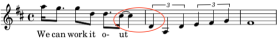 In 1965 the Beatles found yet another way to use the 0.533 duration ratio in We Can Work It Out, shown at the left. Here, Lennon and McCartney used a sixteenth note tied to a quarter note and followed those with a quarter note triplet. This formation only exists because Lennon and McCartney added a very unusual interval, the major seventh, to this rarely used formation to form the hummable triplet tag at the every end of the song. Calculation: (2.667 / (1 + 4) or 0.533.