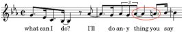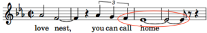 This duration ratio has been used only a few times, and we leap forward 100 years to cite our next instance, Till There Was You from The Music Man (1950) by Meredith Wilson. The interval is a major second downward (-2 MIDI) and the formation is a triplet quarter note followed by a whole note tied to an eighth note. This formation doesn’t appear as though it should be as rare as it is, so we are surprised that it has been used in only a handful of tunes. Calculation: (16 + 2) / (4 x 2/3) = 6.75.