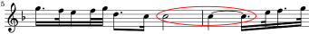 Our last example is from a rock tune, I Will Follow Him, by Little Peggy March in 1963. The 8.25 duration is formed with notes that each are double the value shown in our first example, the Bach courante. The interval used is a perfect fourth (+5 MIDI). It is easy to understand why the 8.25 duration ratio is uncommon. The formations are necessarily complicated in order to reach the required ratio of 33/4 duration values. Calculation: (16 + 6) / 2.667 or 8.25.