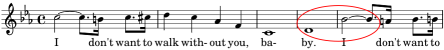 We don’t find the 0.688 duration ratio in the 1800s at all. Our instance in the 20th century comes from I Don’t Want to Walk Without You from Sweater Girl, a song by Jule Styne in a 1942 film about college kids putting on a show while solving a series of murders. Styne uses a minor sixth interval, itself unusual, in a whole note followed by a half note tied to a dotted eighth note. Calculation: (8 + 3) / 16.