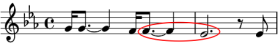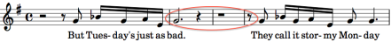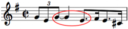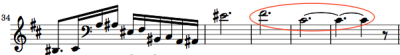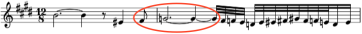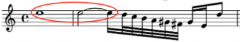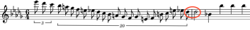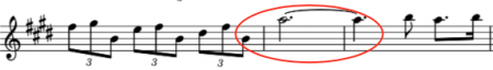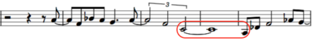 We skip over a 19th century example using rests to jump to a jazz tune called Orbits, written in 1967 and shown at the left. The composer, Wayne Shorter, used a minor third interval (downward in pitch) from a half note triplet tied to a whole note and followed by an eighth note. This formation is also not simple, but it does cross our threshold of having no more than one consecutive tie. Calculation: 2 / (5.333 + 16) or 0.094.