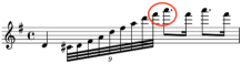 Nearly a century later, Friedrich Kuhlau used the 13.5 duration ratio in the adagio from his Trois Grands Solos No. 1, Op. 57 in 1810. Shown at the left, the 13.5 duration ratio is achieved by following a triplet 32nd note with a quarter note tied to a 32nd note. Calculation: (4 + 0.5) / (0.5 x 2/3) = 13.5.