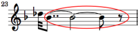 A century and a half later Debussy used this duration ratio in his impressionistic Prelude to the Afternoon of a Faun, written in 1894, shown at the left. His formation consists of a simple eighth note followed by a dotted half note tied to a quarter note tied to a 32nd note. Because Debussy painstakingly wrote out precisely how he wanted his pieces to be played, he has a lot of unusual and rarely used duration ratios and patterns, of which this is one example. Calculation: (12 + 4 + 0.5) / 2 = 8.25.