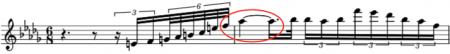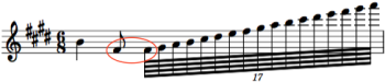The first use of the 0.176 duration ratio is in Tchaikovsky’s Sleeping Beauty Ballet, written in 1889. We find it in the measure at the left in the andante movement of the finale from Scene No. 4 in the prologue. The formation of the duration uses only two notes, but it achieves the 0.176 ratio by including one of the notes in a 17-note tuplet. There is no pitch change between the two notes. Remember that a 64th note is worth 0.25 in our duration value system. Calculation: (24/17 x 0.25) / 2 or 0.176.