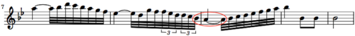 The 0.688 duration ratio is another of those that appear as though they should be much more common than they are. The first instance we found was in 1712 in Benedetto Marcello’s Adagio I from Recorder sonata No. 1 in F, Op. 2. Marcello used a half note followed by a quarter note tied to a dotted sixteenth note. There is no pitch change. Marcello used this duration ratio in several of his sonatas, but few composers after him employed it. Calculation: (4 + 1.5) / 8 or 0.688.