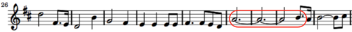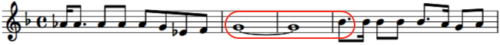 Our final example of the 16.5 duration ratio uses a quite different formulation from the first two. Shown at the left is a portion of Brazil by Ary Barroso, a popular and still well-known Latin tune from 1939. Barroso created the pattern with a quarter note followed by an eighth note tied to a series of four whole notes. Calculation: {2 + 16 + 16 + 16 + 16) / 4 or 16.5