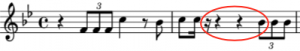 The 0.148 duration ratio makes its first appearance in the database in the duet, Act 2, of Bizet’s Carmen, shown at the left. This instance from 1817 involves rests, as does the next one, but both are from well-known pieces so we include them. Here, Bizet follows a rest of duration 9 (1 for the 16th rest, and 4 each for the quarter rests) by an eighth note triplet. Calculation: 1.333 / (1 + 4 + 4) or 0.148.