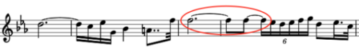In the 19th century we have a quite different formation of the 1.714 duration ratio that uses a dotted eighth note tied to a quarter note that’s followed by a dotted half note. The interval is large: 17 steps. This formation is in the Peer Gynt Suite by Edvard Grieg, notably his “Solvejg’s Song,” a popular piece played by orchestras, originally composed by Grieg in 1875. Calculation: (8 + 4) / (3 + 4) or 1.714.
